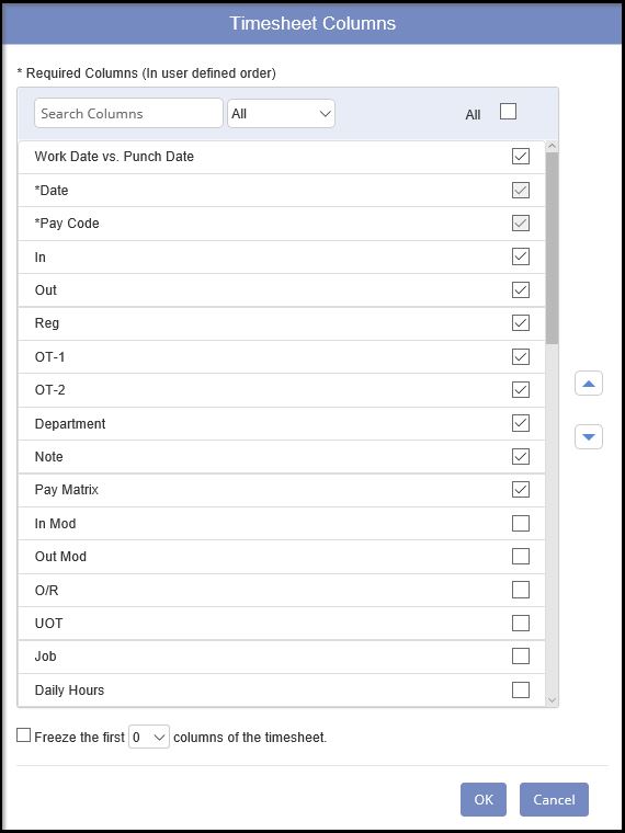 The Columns button is used to configure the columns and their order that will be displayed on the timesheet page. It allows you to configure the columns on this timesheet screen. Some of the columns are: