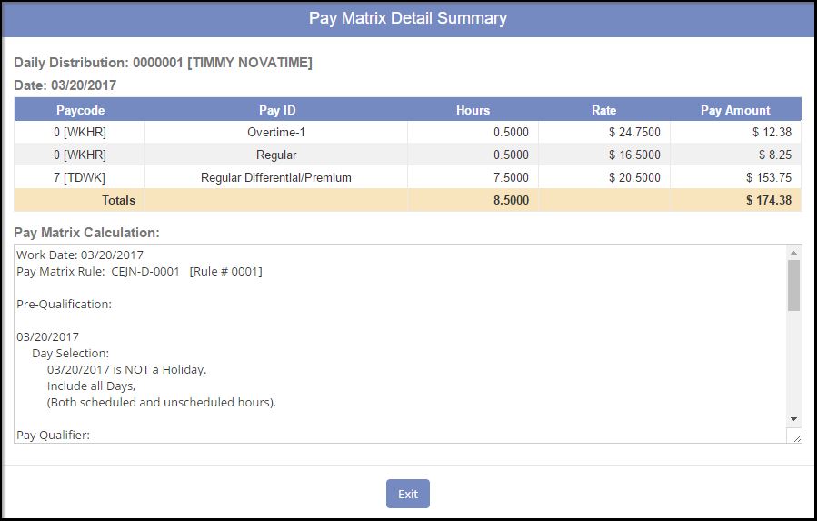 for any record, and they can view the Pay Matrix Daily Distribution to review how the employee hours were distributed. Also available is the Pay Matrix Calculation or Audit area. This can be used to review how the system calculated the Pay Matrix Daily Distribution area.