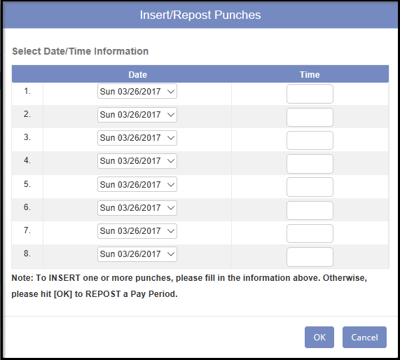 The Insert / Repost button is used to quickly insert one or more missing punches. A good example for the use of this option is forgotten meal punches. If no time entered and click OK, it will re-shuffle punches for this employee for this pay period.