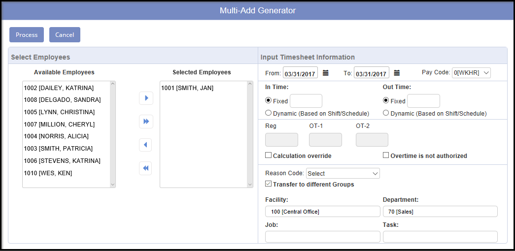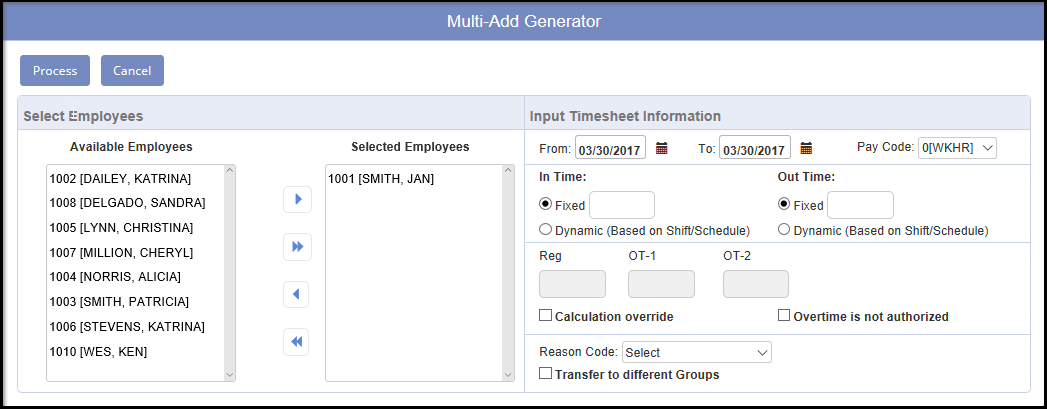 Multi Add - The Multi Add button is designed to create multiple attendance records for the employee. It is recommended that use of this feature be restricted to qualified employees only. If multiple records are added in error, the only way to remove them is to manually delete them record-by-record, employee-by-employee.