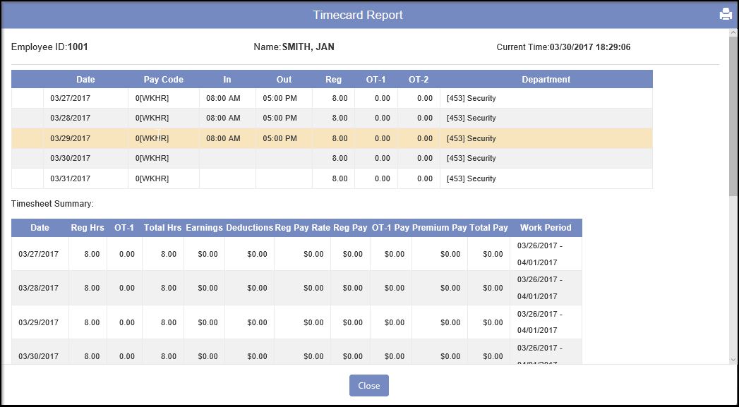 The Print button is used to display the employee's timesheet in a printer-friendly format with an option to send it to a printer (continued below).
