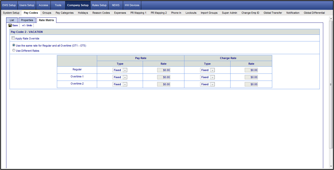 The Pay Codes>Rate Matrix page is used to configure pay rates that are specifically associated with the pay code. This feature is normally not used for companies using standard pay rules.